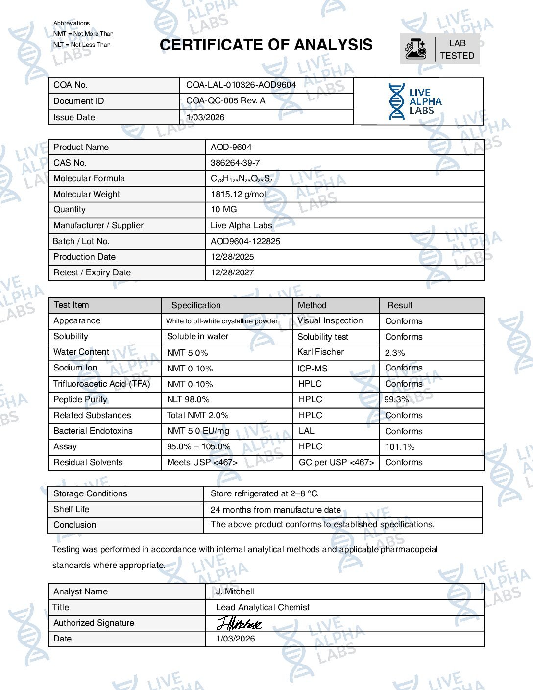 AOD-9604 in lyophilized powder form packaged in a sealed glass research vial. This synthetic peptide fragment is used in biochemical assay development and receptor pathway studies. Packaged for consistency and lab handling. Intended strictly for professional research environments.