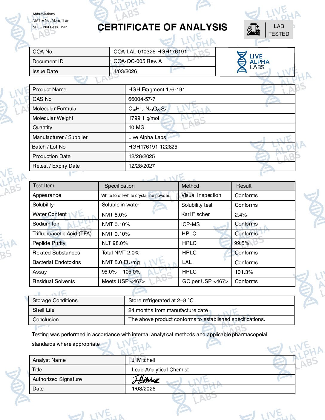 HGH Fragment 176-191 is a synthetic fragment of human growth hormone composed of amino acids 176-191 studied for its role in metabolic pathways and fat metabolism. This product is supplied in a vial for laboratory research only. Packaged in a frosted glass vial with a matte black cap and metallic cobalt ring.